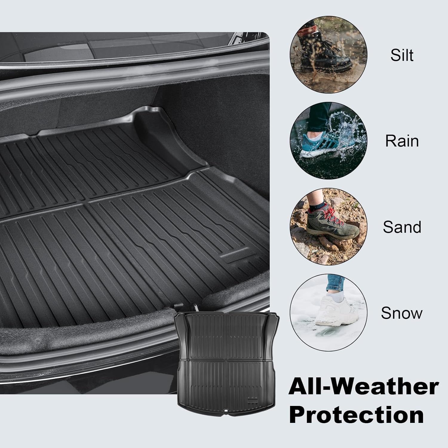 This is a durable, all-weather TPE trunk tailgate mat designed for the Tesla Model Y (2021–2025). It protects the trunk door, is easy to clean, and fits perfectly for added practicality.
