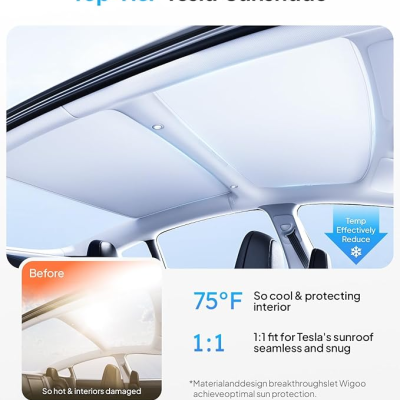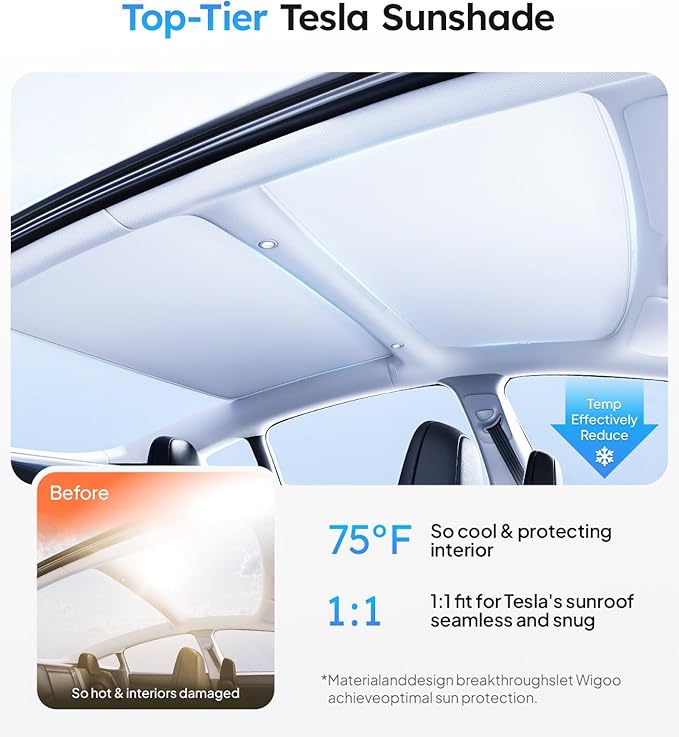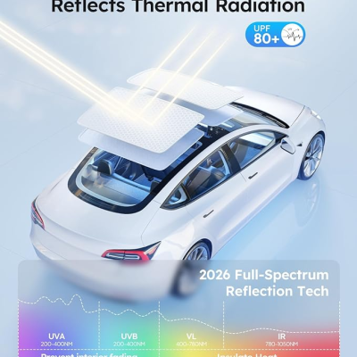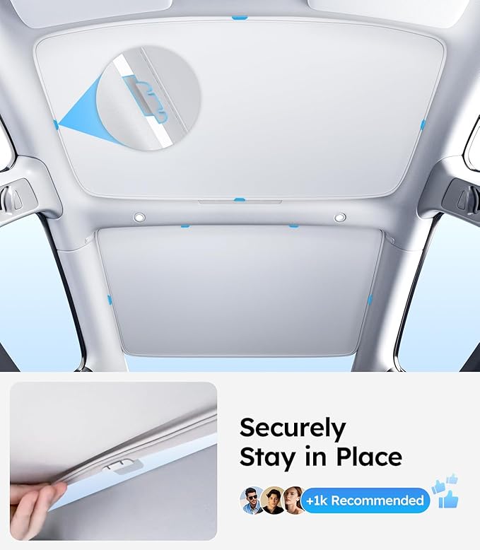 This custom-fit sunshade is designed exclusively for the Tesla Model Y Juniper, with precision-molded panels that integrate seamlessly with the panoramic roof for a factory-like look and zero sagging. Featuring dual-layer, high-density nano-crystal fabric with a reflective silver coating, it delivers superior UV and heat protection to keep the cabin cool and shield the interior from sun damage. The upgraded memory steel rim design allows for 60-second tool-free installation via clips, and quick, compact folding for hassle-free storage. Each set includes front/rear shades, mounting clips, a storage bag, and 24/7 customer support for full peace of mind.